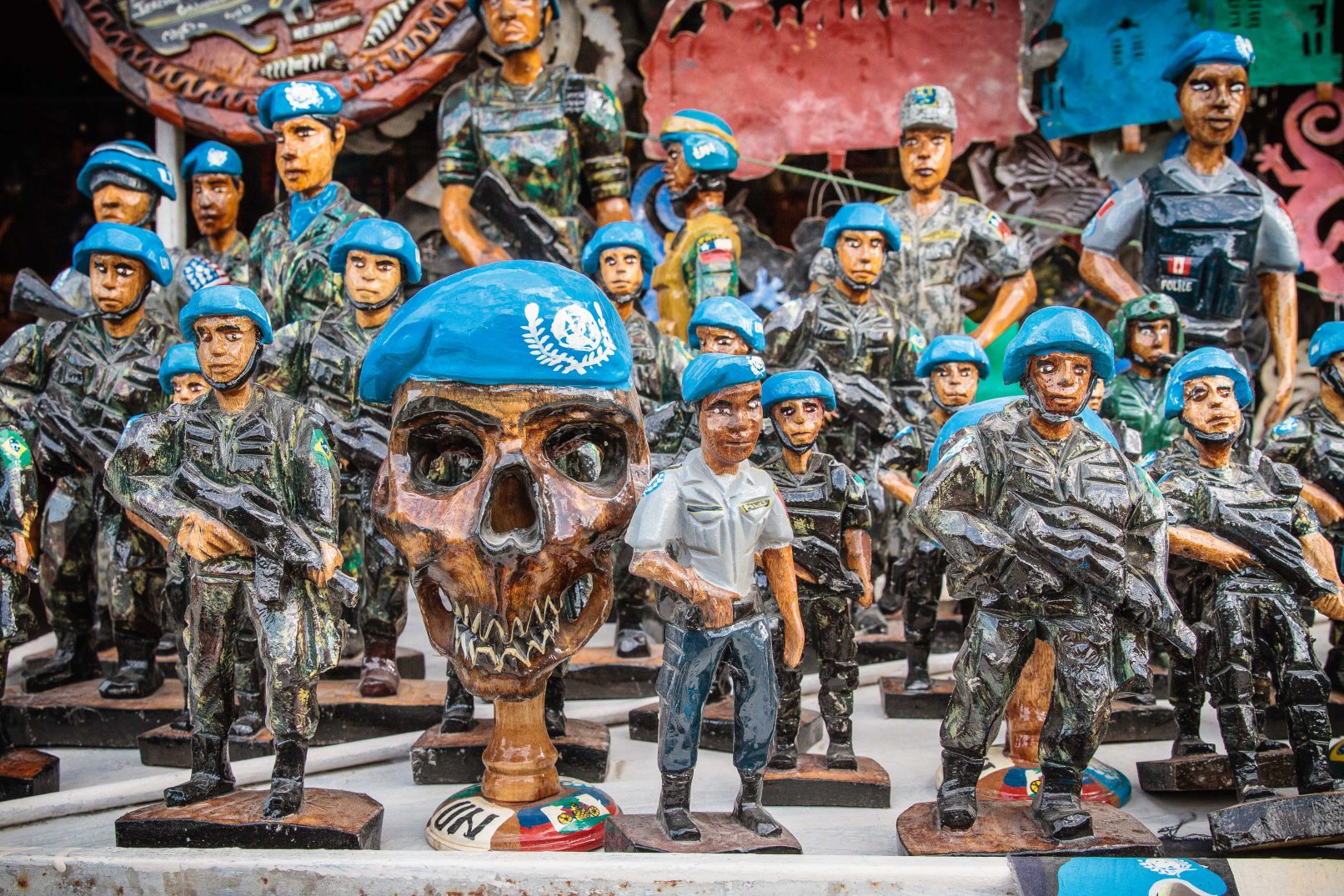 Wood carving of UN soldiers and police in Port-au-Prince.